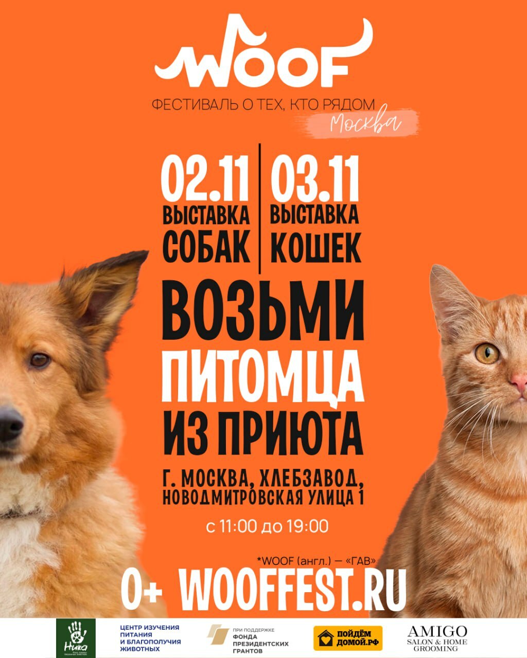 Генеральные партнёры фестиваля: Центр изучения питания и благополучия животных, проект пойдемдомой.рф и бренд Amigo.